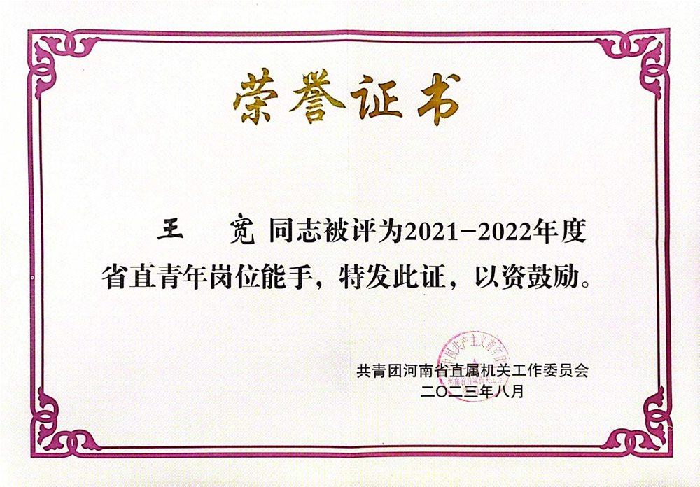 日前,共青团河南省直属机关工作委员会命名了“2021-2022年度省直青年文明号和青年岗位能手”,中心地质环境调查一所王宽同志榜上有名,荣获“2021-2022年度省直青年岗位能手”称号。