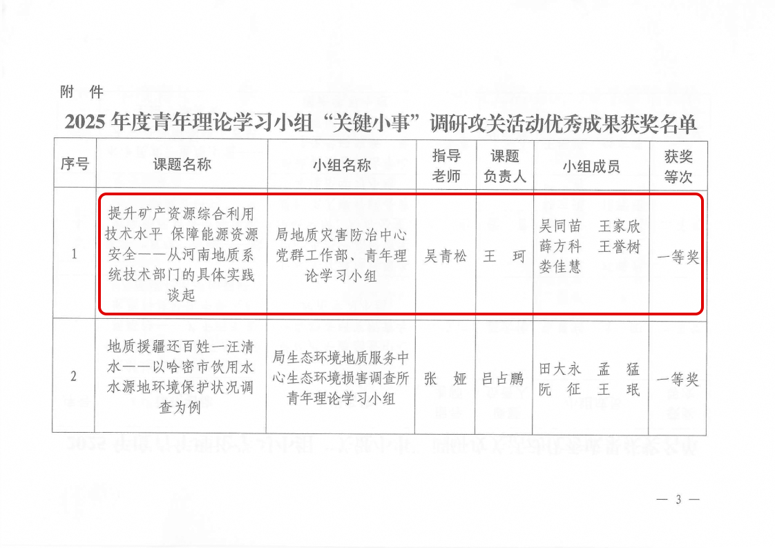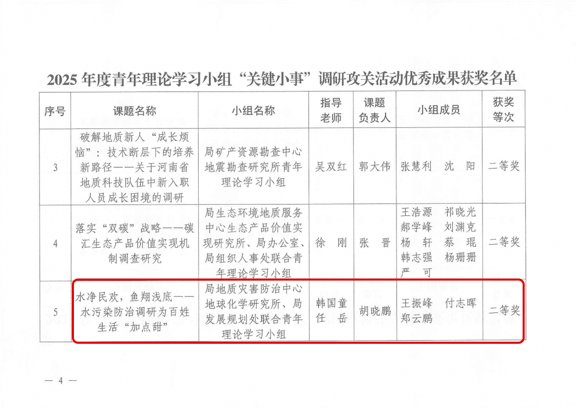 近日,省地质局机关党委通报了2025年度青年理论学习小组“关键小事”调研攻关活动优秀成果。中心党群工作部青年理论学习小组调研成果《提升矿产资源综合利用技术水平 保障能源资源安全——从河南地质系统技术部门的具体实践谈起》荣获一等奖,地球化学研究所青年理论学习小组调研成果《水净民欢,鱼翔浅底——水污染防治调研为百姓生活“加点甜”》荣获二等奖,地质实验测试所青年理论学习小组调研成果《以科技创新守护耕地生态安全》荣获三等奖。