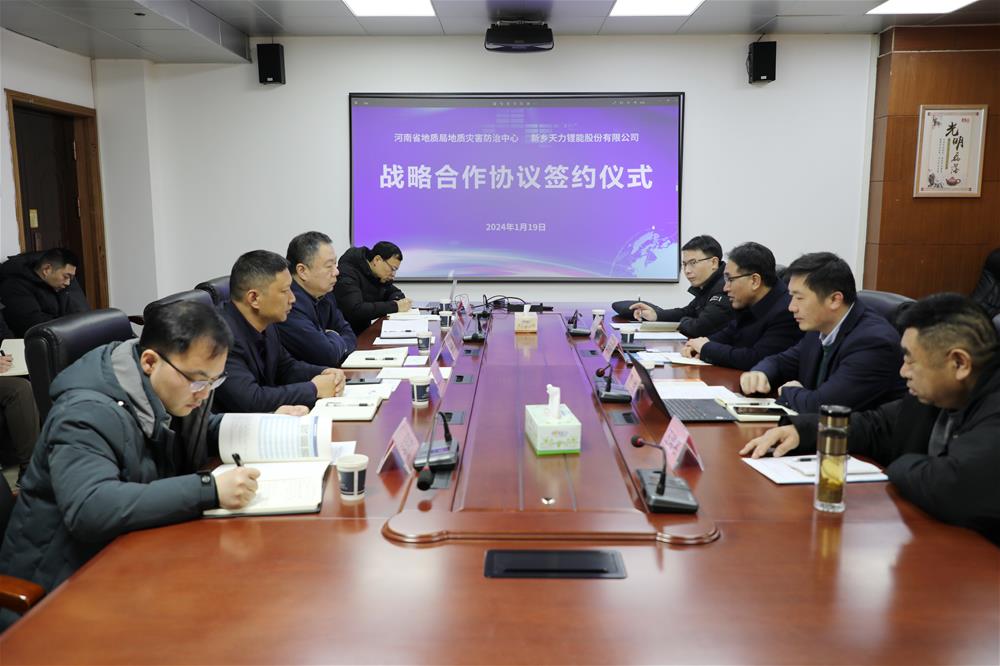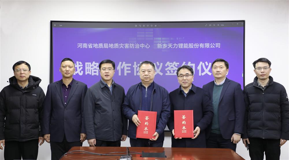新乡天力锂能股份有限公司董事长王瑞庆、河南省地质局地质灾害防治中心党委书记吴青松分别致辞并代表双方签署战略合作协议。公司副总经理李明、办公室主任杜昆,中心副主任闫红岭、张凤斌出席。