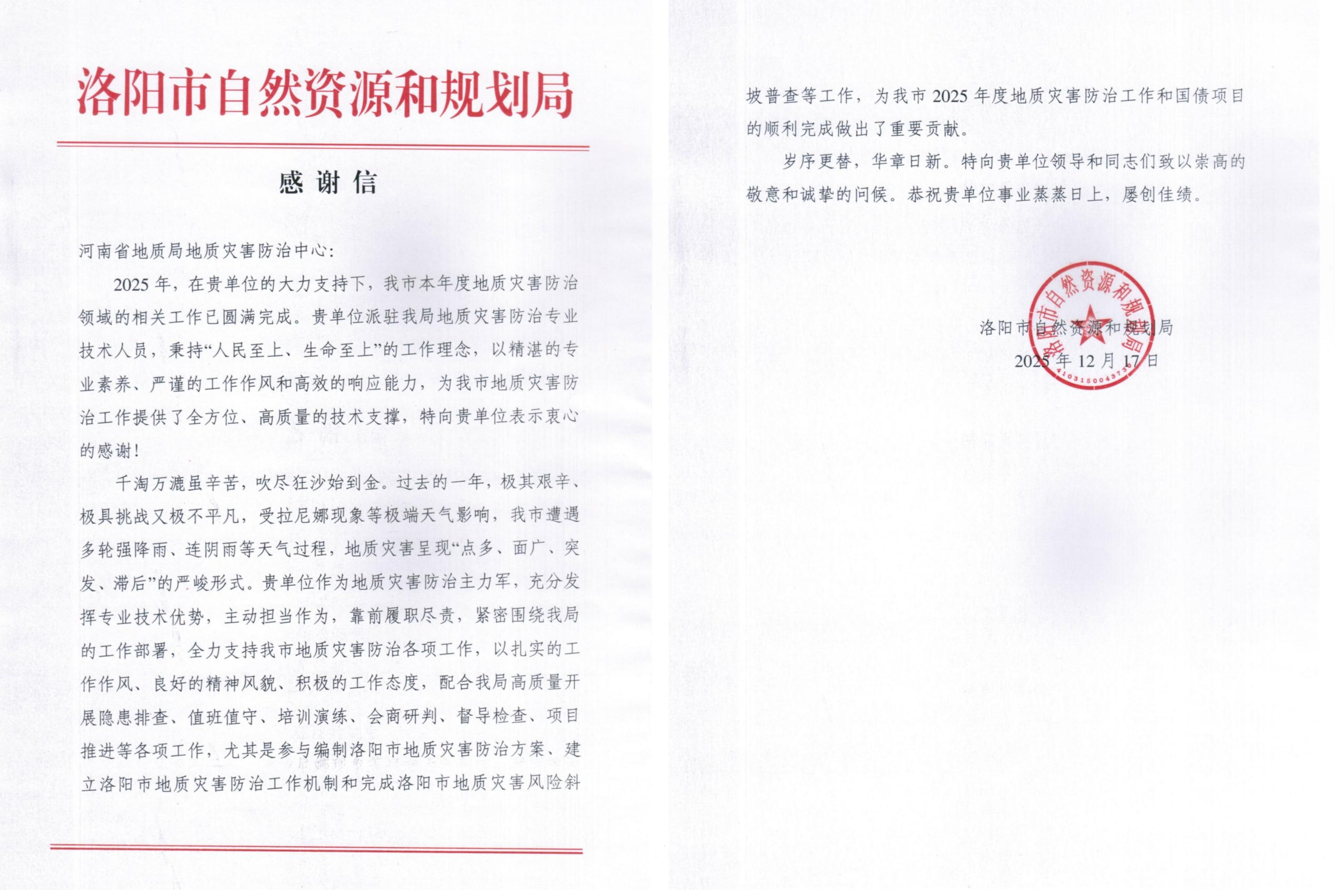 近日,洛阳市自然资源和规划局向我中心致送感谢信,对中心在2025年度洛阳市地质灾害防治工作中给予的全方位技术支撑和鼎力协助,致以诚挚的感谢和崇高的敬意。