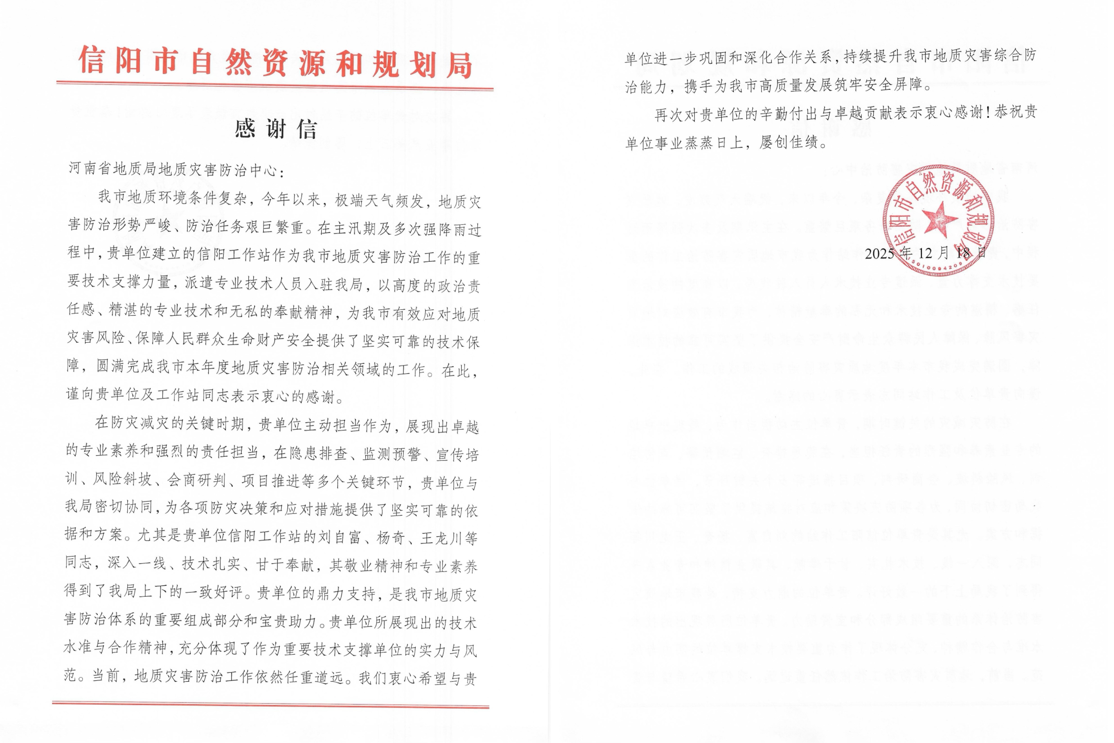 近日,中心收到信阳市自然资源和规划局发来的感谢信,信中对中心信阳工作站在地质灾害隐患排查、监测预警、宣传培训、风险斜坡排查、会商研判、项目推进等多个环节提供的技术支撑表示充分肯定。