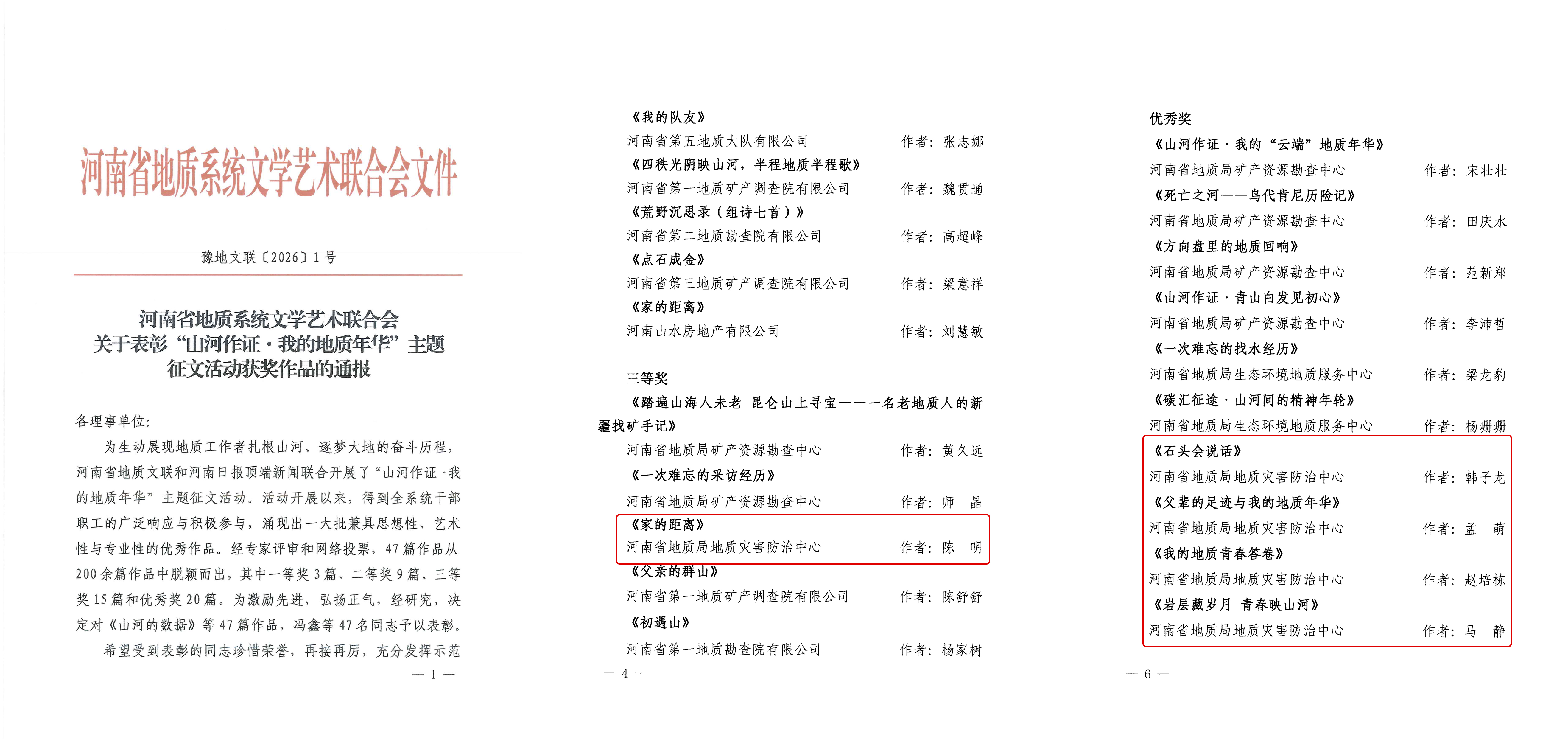 近日,河南省地质系统文学艺术联合会与河南日报顶端新闻联合主办“山河作证・我的地质年华”主题征文活动,中心多名职工喜获佳绩。其中,地质灾害防治工作站服务保障部陈明《家的距离》荣获三等奖;金银珠宝饰品质量检验研究所韩子龙《石头会说话》、孟萌《父辈的足迹与我的地质年华》,地质环境调查二所赵培栋《我的地质青春答卷》,资产财务审计科马静《岩层藏岁月 青春映山河》荣获优秀奖。